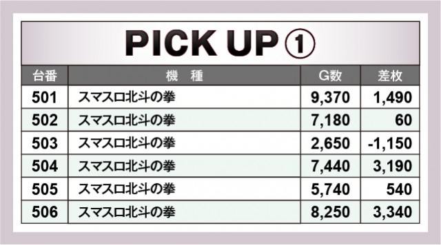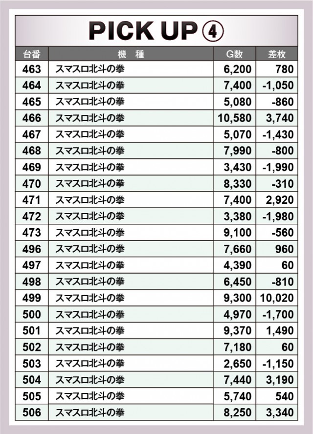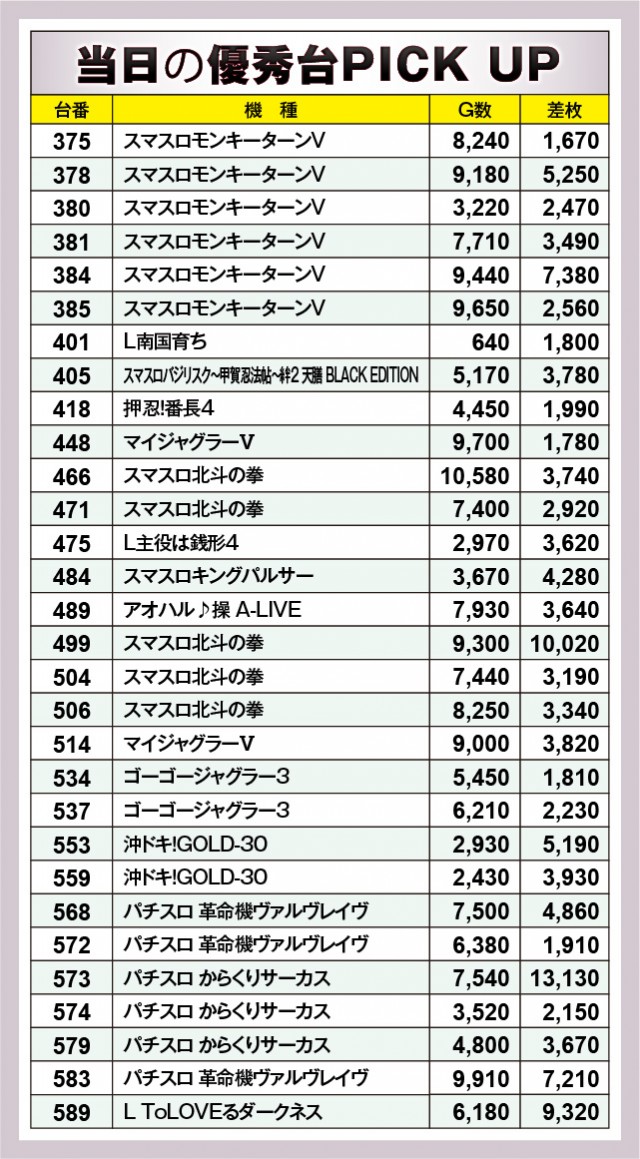 老若男女問わず幅広い世代に好まれていた『スマスロ北斗の拳』は、設置されている全22台の結果が上表の通りとなっている。499番台+10,020枚という記録が目立っているが、それ以上に特徴的なのは、大きなマイナスが築かれていないという点だ。これはコンスタントにAT当選を果たしていたという証拠であるため、同店が如何に同機種へ愛情をもって接しているのかが分かる内容となっている。