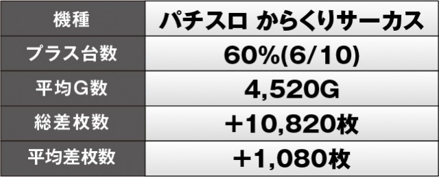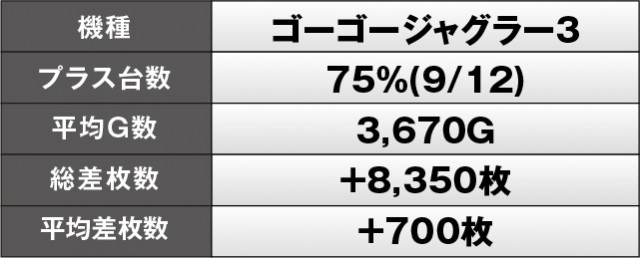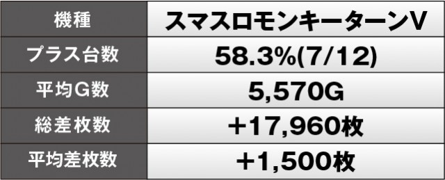 『スマスロモンキーターンV』『パチスロ からくりサーカス』は総差枚数5桁OVERを記録しており、各所でまとまった出玉を獲得していた様子が窺える。平均差枚数も1,000枚OVERとなっているため、ファンはレバーを叩く喜びを感じていたはずだ。また『ゴーゴージャグラー3』は勝率75%をマークし、こちらもコンスタントなボーナス当選を想像できる格好となっている