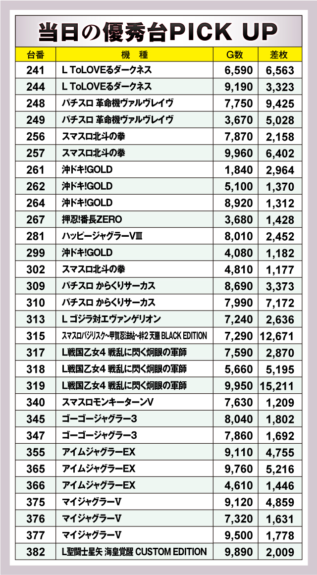 まずは優秀台30台のチェックから。30台のうち19台が+2,000枚オーバーを記録し、+3,000枚オーバーは13台出現。さらに大台突破の+10,000枚オーバーは2台出現と圧倒的な好成績を見せつけた! それらのなかでもっとも優秀だったのは、319番台の「L戦国乙女4 戦乱に閃く炯眼の軍師」で、差枚+15,211枚をマーク! またランクイン機種を見渡すと、「ゴーゴージャグラー3」を筆頭にジャグラーシリーズが多数ランクインしていたので、人気機種を中心にチャンスが隠されていた可能性が高そうだ!