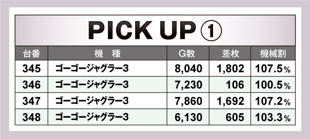 続いては、当日特に賑わっていたジャグラーシリーズの中から、とくに注目すべき「ゴーゴージャグラー3」を紹介しよう。ピックアップしたのは並びで賑わっていた4台で、4台全てがプラス終了をマーク! さらにそのうち2台が差枚+1,000枚を超えており、平均差枚は+1,051枚と素晴らしい結果を残していた! もちろんその他ジャグラーシリーズにも多くの台から好記録が出現していたぞ!