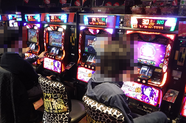 朝イチのパチスロでは、「バジリスク~甲賀忍法帖~絆」などに遊技をはじめるプレイヤーの姿があった。