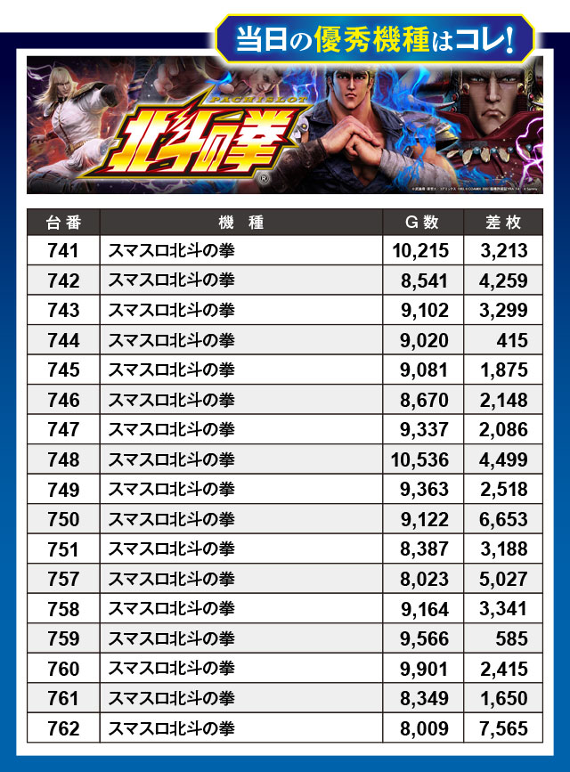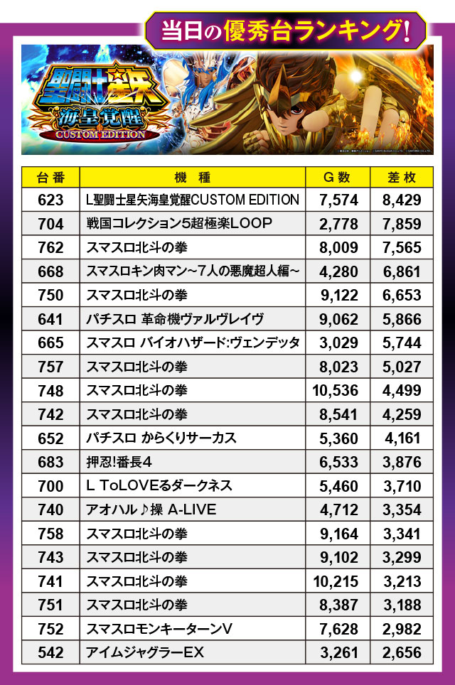 この日の首位記録に輝いたのは、『L聖闘士星矢海皇覚醒CUSTOM EDITION』。ある意味『星矢』が首位に立ったのは平常運転だが、2位にはバラエティー機種の『戦国コレクション5超極楽LOOP』がランクインする波乱の結果に。さらにこの日のTOP20結果には、『スマスロ北斗の拳』が9台もランクイン!