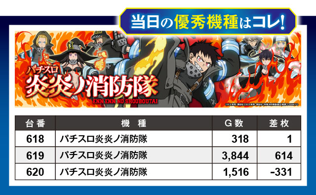 3台設置の『パチスロ炎炎ノ消防隊』だが、いずれの台も総ゲーム数が少なく、結果は振るわず…。しかし619番台には優秀台挙動も見て取れたので、3台ともに回されなかったのがもったいない結果に。