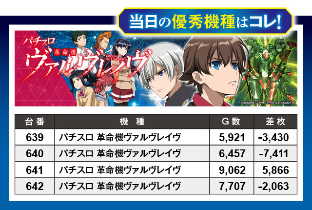 4台設置の『パチスロ 革命機ヴァルヴレイヴ』は大きな注目を集めていたが、結果の方はご覧の通り。641番台だけがそのポテンシャルを存分に発揮し、+6,000枚に迫る好結果を叩き出すことに成功!