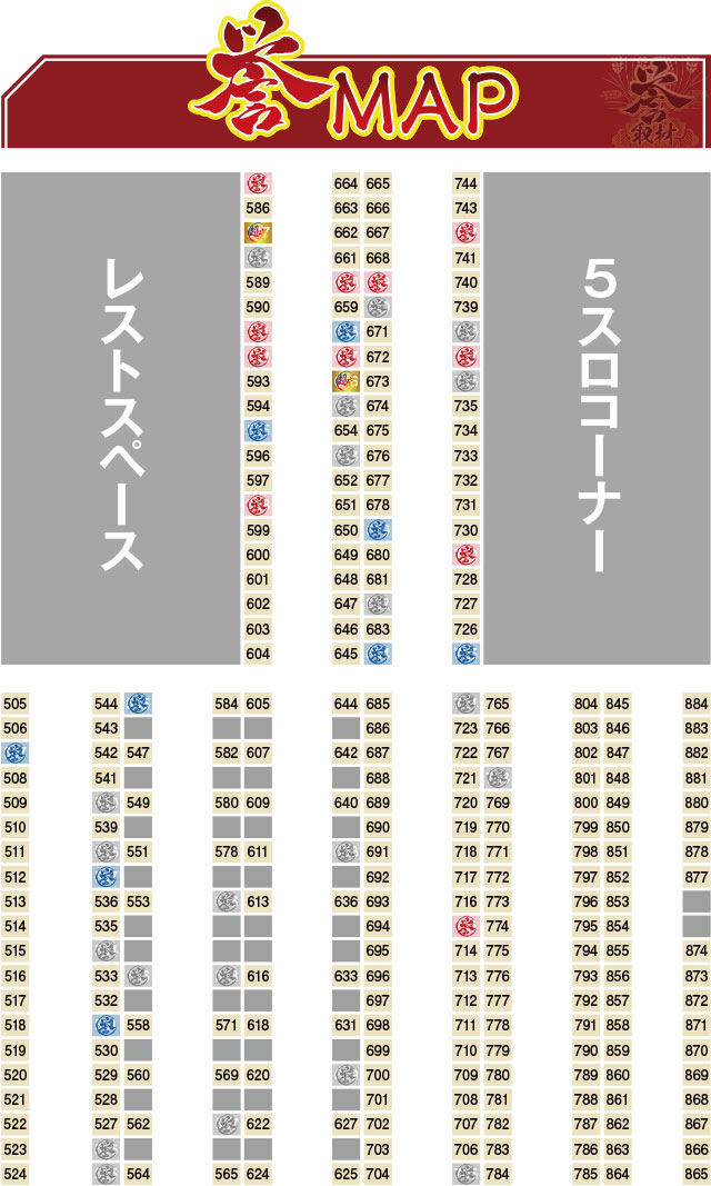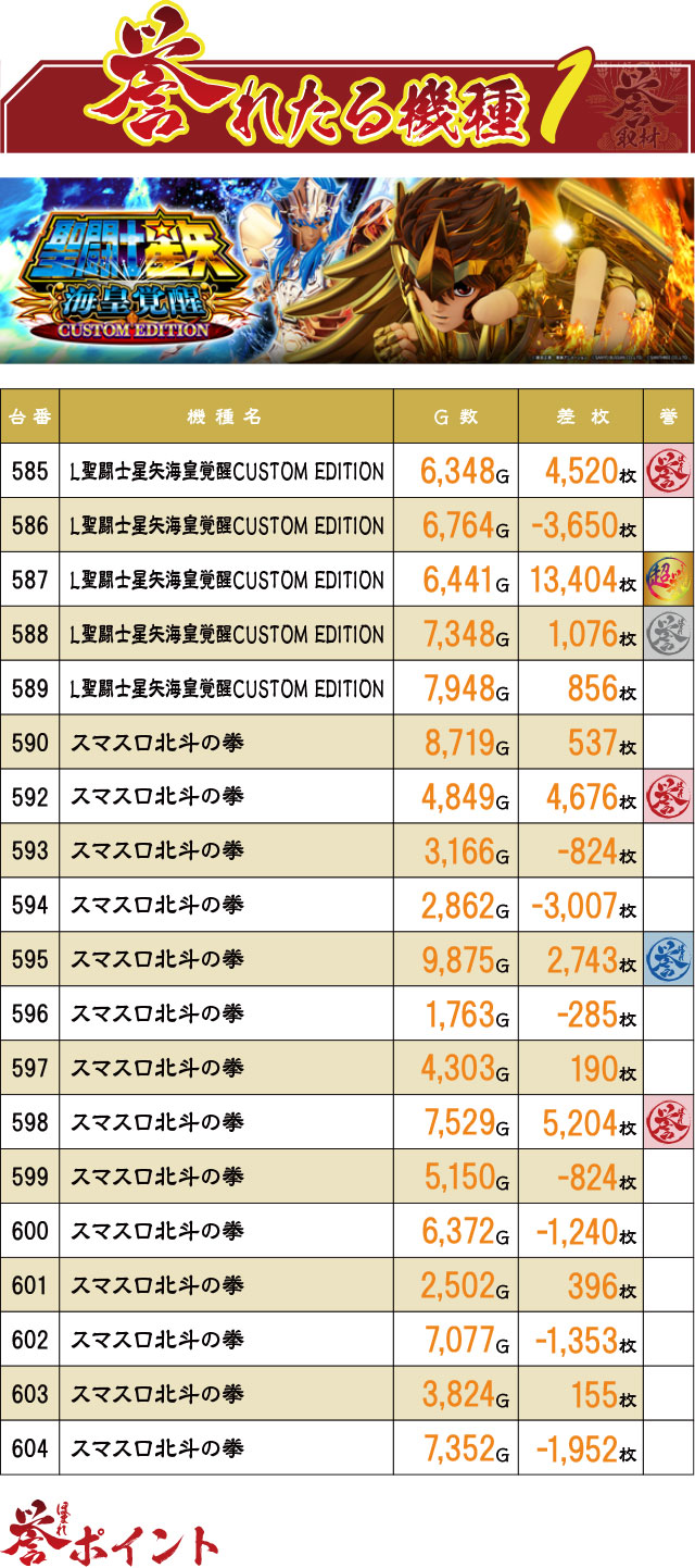 『L聖闘士星矢海皇覚醒CUSTOM EDITION』と『スマスロ北斗の拳』が並ぶこちらのブロックでは、『星矢』の587番台が頭角を表し、気づけば+13,000枚超えを達成!『北斗』の方は勝率は約5割ほどながらも、赤誉マークが2台出現していた。