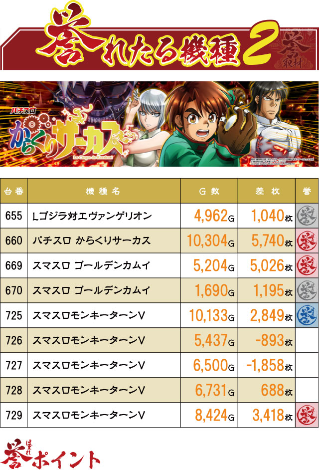 人気マシンがズラリ並んだこちらのブロックからも誉マーキングが続出!特に『パチスロ からくりサーカス』と『スマスロ ゴールデンカムイ』からは、+5,000枚を上回る結果がお目見え!