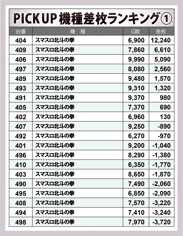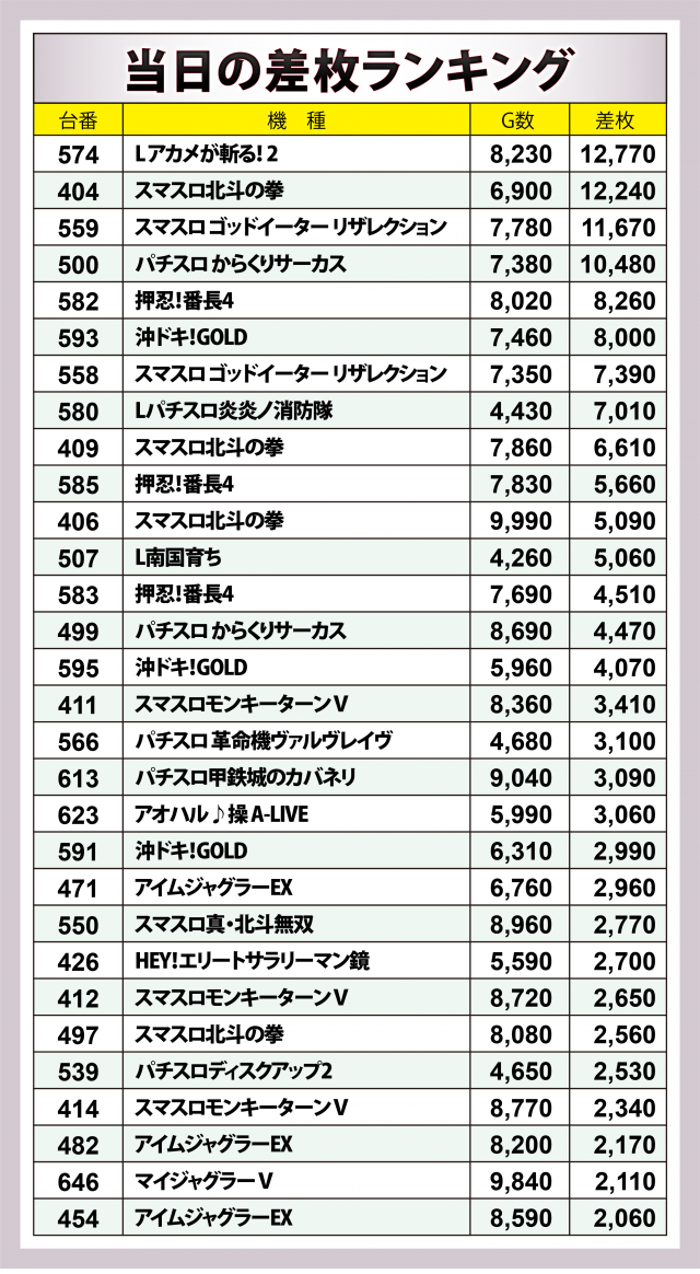中でも『スマスロ北斗の拳』が+12,200枚超を叩き出した他、『押忍!番長4』では+8,300枚弱&+5,7000枚弱&+4,500枚超が1台ずつと、大量獲得のチャンスが潜んでいた。