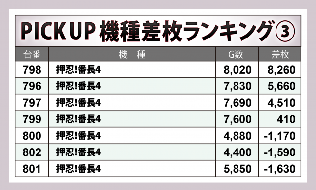 後述する好況3機種以外では、+12,800枚弱の『Lアカメが斬る!2』574番台が全214台の頂点に輝き、『スマスロ ゴッドイーター リザレクション』が+11,700枚弱&+7,400枚弱と続き、導入間もないマシンが実力を十二分に発揮した。