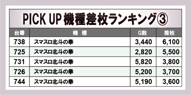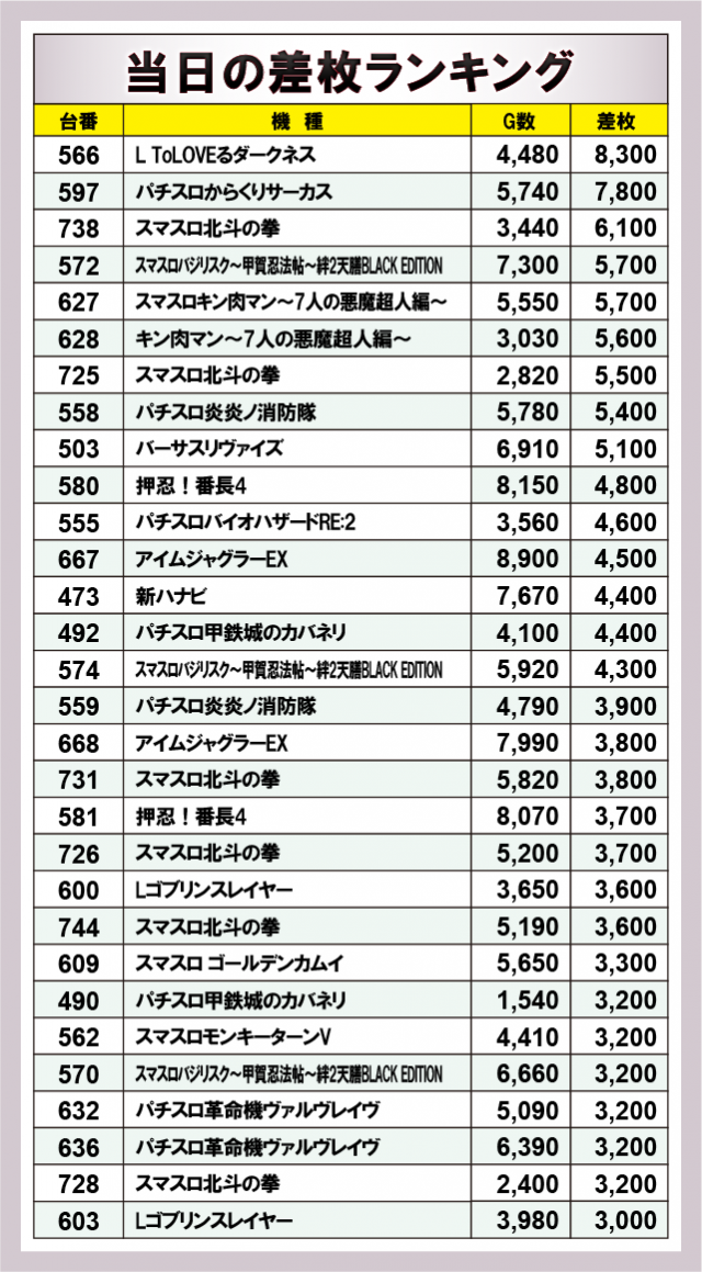 上表にある通り、『L ToLOVEるダークネス』4480番台・8,300枚、『パチスロからくりサーカス』5740番台・7,800枚、『スマスロ北斗の拳』3440番台・6,100枚などスマスロ機が上位にくるほか、『パチスロ炎炎ノ消防隊』『バーサスリヴァイズ』『新ハナビ』などの活躍も目立ち、スマスロ機からメダル機まで様々な機種が名を連ねている事実は、同店の実力の高さを示していると言って過言ではない。
