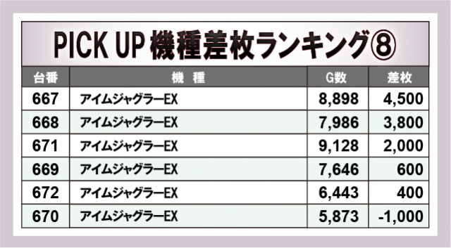 優秀機種として8機種を取り上げているが、いずれも大きなマイナスを築いた台が少ないことから、多くの台が可能性を秘めていたと分かる。そこから読み取れるのは全台がポテンシャルを秘めていたということで、ゲーム数の多さも相まって、相当な手応えを感じられる状況だったのだろう。