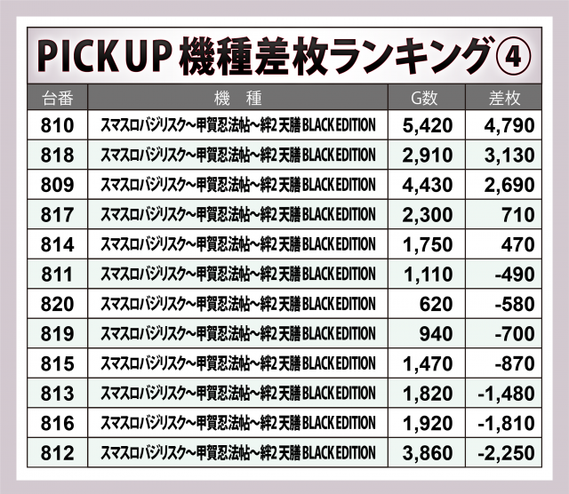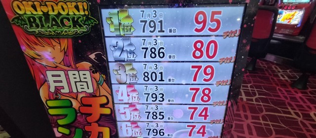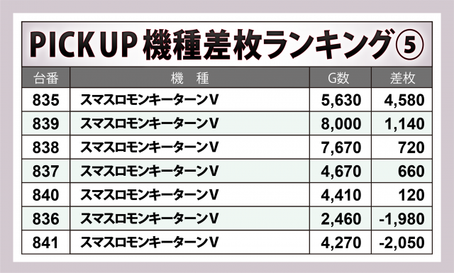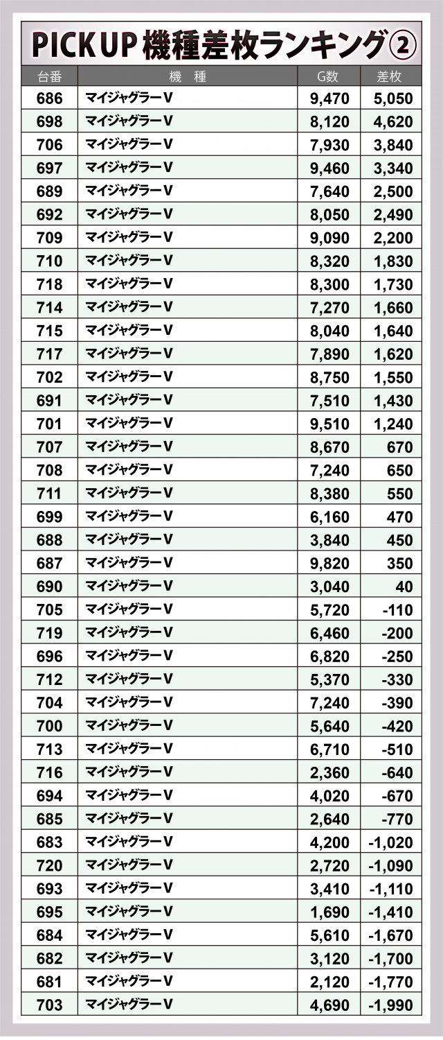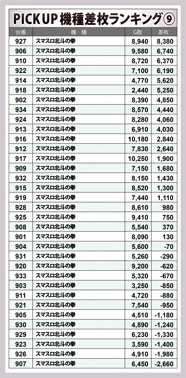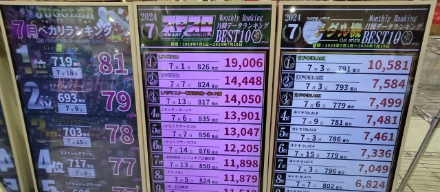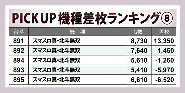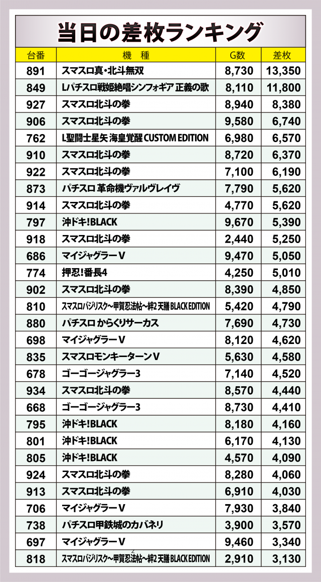 さらに『スマスロ北斗の拳』では+8,400枚超が1台&+6,000枚オーバーが3台&5,000枚クラスが3台、『沖ドキ!BLACK』では+5,400枚弱×1&+4,000枚超×3、『マイジャグラーⅤ』の+5,100枚弱と、多くのシマがハイクラスな成果を結んだ。