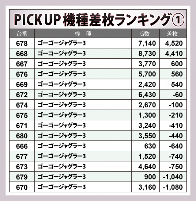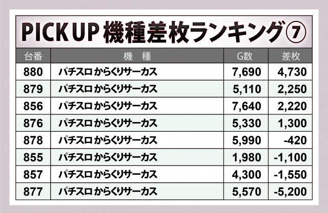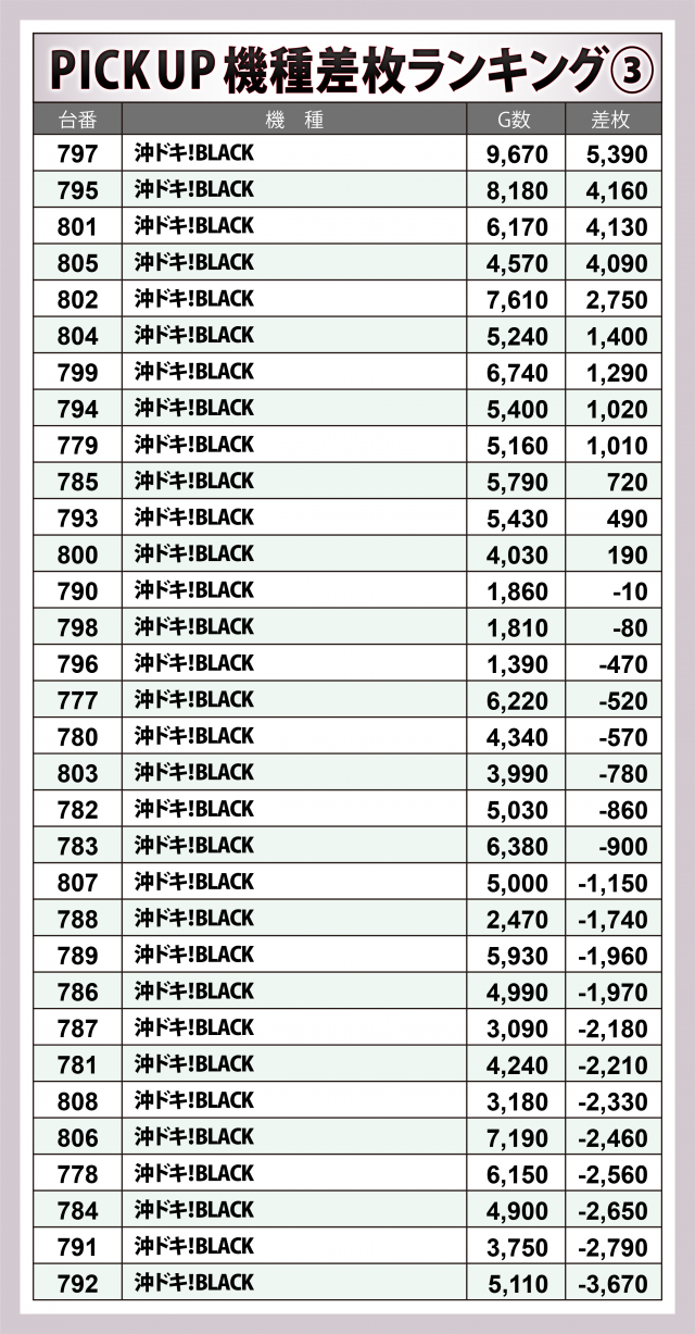 最初はこの日の上位30台をチェック。なんと30台の全てが+3,000枚以上となるハイクオリティぶり。また、+4,000枚以上は26台、+5,000枚以上は13台、+6,000枚オーバーは7台、+8,000枚オーバーは3台、そして万枚突破台は2台と、歴代回に匹敵する内容を誇った。