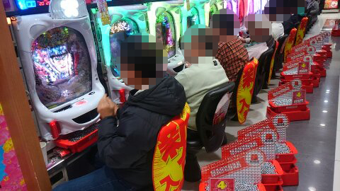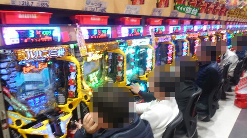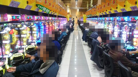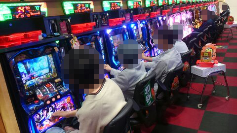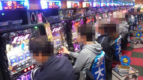 低貸し5円スロットコーナーは大人気。コーナー一帯は多くのプレイヤーであふれ微笑ましい光景が広がっていた。