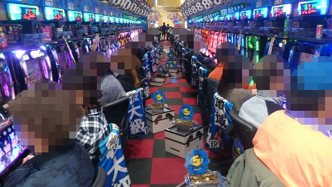 ミドルタイプ「CR花の慶次X~雲のかなたに~」「CRルパン三世~Lupin The End~」のシマは朝イチから高稼働を披露しており、午後になってもその勢いは留まることなく、一帯には羨ましい光景が広がっていた。