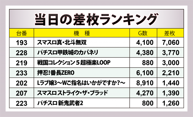 前回と同じくトップ7の差枚数をクローズアップした。7台全てが+1,000overをマークし、+2,000枚以上は4台、+3,000枚以上は3台、+7,000枚オーバーは1台となった。