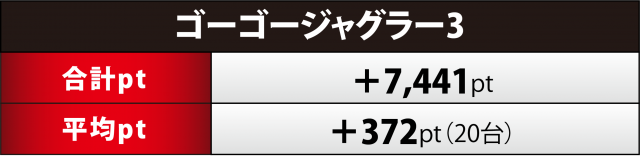 『ゴージャグ』20台は合算で+7千4百超をマーク。プレイヤーの勝利は10台と全体のちょうど半分、プラス4桁は7台&+2千超は3台だったが、+3千超を超える台がなかったのは惜しかった。