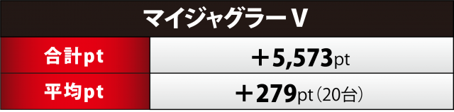 『ファンジャグ』20台も『アイムジャグ』と同等となる合計ptを残した。プラスは13台と全体の3分の2弱、6台が4桁プラス&850番台が+3千6百超とシマトップとなったが、+2千超が1台と、もう少し突き抜けた台があればさらに良かった。