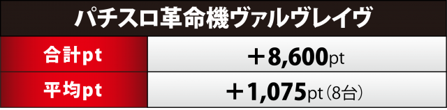 『ヴァルヴレイヴ』8台もプラス4桁の平均ptに成功。プラス率は50%(4台)と全体の半分ぴったり、1,000overは3台、そして768番台が+1万1千超の大仕事をやってのけた。