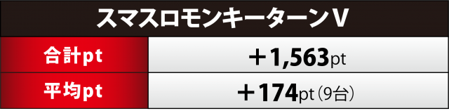 『モンキーターンⅤ』9台はなんとか合計ptをプラスにした。勝ちになったのは4台と全体の半数に届かず1,000overは3台だったが、その3台では743番台が+8千9百超とビッグヒットとなった他に+2千9百弱が2台と、ベスト3が気を吐いた。