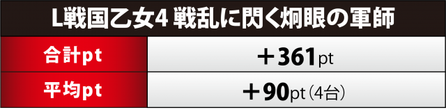 『戦国乙女4』4台はどうにか合計ptをプラスにするので精一杯。勝率は50%(2台)、+2千1百超と+1千1百超が1台ずつと、飛び抜けた台が欲しいところだった。