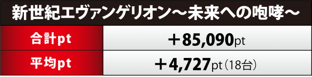 『エヴァ15』18台は通算で+8万5千超となった。プラスは11台と全体の6割超、+1万オーバーは6台、161番台では+4万7千超とホームラン級の出玉が飛び出した。