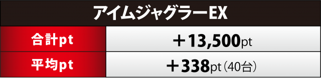 ジャグラーシリーズで最も多い+1万4千弱となる合計ptを記録したのが『アイムジャグ』40台。勝利を得たのは20台と全体のちょうど半分で、1,000overは13台。さらに890番台が+4千1百超のスマッシュヒットとなった他、+3千2百超×1・+2千超×5台と、レベルの高さを見せつけた。