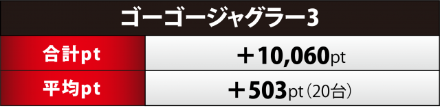 『ゴージャグ』20台も合わせて+1万オーバーをマーク。プレイヤーの勝利は9台と全体の半数を切ってしまったものの、プラス4桁は7台&+3千超が2台・+2千超が4台と上位陣が健闘。加えて、マイナス台がそう大きくない負債だったことも全体に影響を与えた。