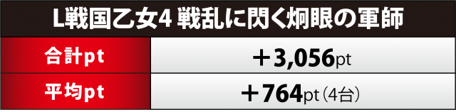 『戦国乙女4』4台は+3千1百超でフィニッシュ。3台が勝利と高水準で、728番台が+5千4百弱の一撃をもたらした他、4桁プラスがもう1台生じた。