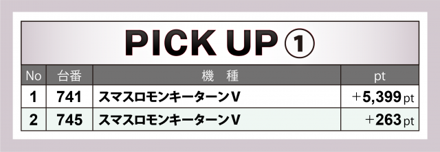 +9千を超える合計ptを成し遂げたのが『スマスロ北斗』20台。勝率は35%(7台)で全体の3分の1強となり少なめだったが、その7台全てが4桁プラスに成功。また、309番台が+8千5百超でコーナー首位となった他、+6千超・+4千9百弱・+3千5百超が1台ずつ&+2千超が2台と、抜きん出た台が多かった。