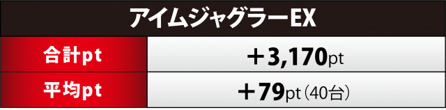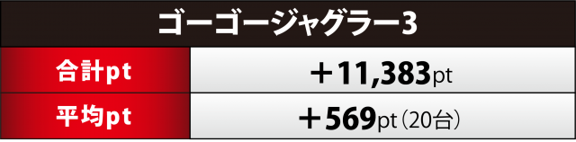 今回、ジャグラー4機種の中で最多となる合計ptをマークしたのが『マイジャグ』20台。勝利を得たのは14台と全体の7割、1,000overは10台、870番台が+4千7百超とハイレコードとなった他、+3千超×2・+2千超×1と、ハイクラスの出玉を誇った。