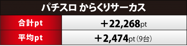 今回の最優秀機種に輝いたのが『パチスロ からくりサーカス』9台。その通算は+2万2千オーバーに達したが、789番台が+1万9千弱という差枚数で全401台の王座に就いたことの影響が大きいだろう。なお、プラスとなったのは5台と全体の6割弱、4台が1,000overとなった上に、+7千6百弱・+2千8百超が1台ずつと、この日一番の盛況を迎えた。