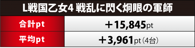 『L戦国乙女4 戦乱に閃く炯眼の軍師』4台も合計で5桁のプラスを成就し、他機種より台数が少ないことから平均ptではこの日のMAXとなった。全台の勝利は逃したが、その3台の全てが+2千オーバーのメダルを残し、+7千8百弱&+6千2百弱が1台ずつと上々。もしかしたら全台系と呼ばれる情勢だったのかもしれない。