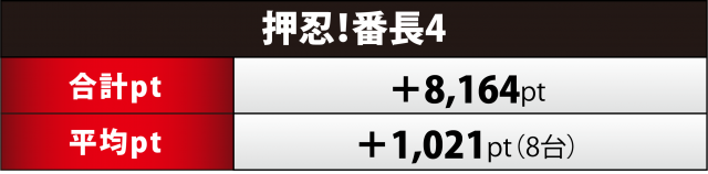 『押忍!番長4』8台は+1万も見える合計に到り、平均ptでは4桁の数字を成立。全体の半数となる4台が勝利となり、1,000overは3台、コーナー首位となった698番台が+8千超、さらに+4千9百超&+2千3百超が1台ずつと、上の3機種と遜色ない出来を見せた。