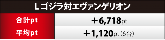 『L ゴジラ対エヴァンゲリオン』6台はトータル+7千弱、こちらも1台あたり+1千を超える数値を計上。プラス台は3台と全体の半数、797番台が+6千1百弱、さらに+3千弱が1台と、こちらにもチャンスが窺えた。