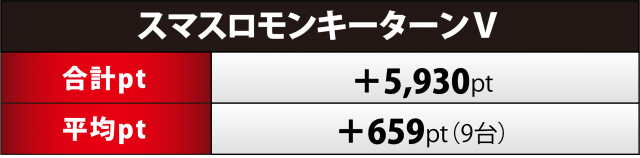 『スマスロモンキーターンⅤ』9台も全体をプラスで終えた。勝利となったのは5台と全体の半数を上回り、742番台が+6千7百弱で当機種におけるナンバーワン、また+5千2百弱&+2千2百超が1台ずつで、+5千オーバーが2台とこちらでもビッグヒットに溢れていた。