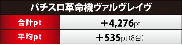 『パチスロ 革命機ヴァルヴレイヴ』8台も合計をプラスで満たした。勝利となったのは4台と全体のちょうど半分&4台全てが1,000over、764番台が+9千8百超と万枚の鼻先まで届き、+3千3百超が1台と、合計pt以上の活況が感じられた。