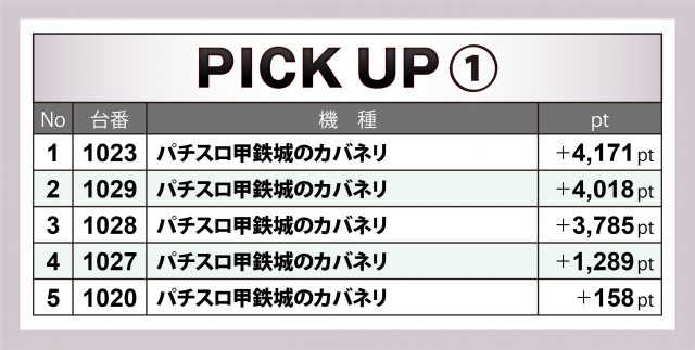 上で述べた台以外では『L花の慶次~佐渡攻めの章〜』683番台が+1万2千オーバーの大仕事を果たし、次いで『スマスロバジリスク~甲賀忍法帖~絆2 天膳 BLACK EDITION』では287番台が+8千3百超&289番台が+5千3百弱、『アナザーゴッドハーデス-解き放たれし槍撃ver.-』1033番台が+6千2百超、『L聖闘士星矢 海皇覚醒 CUSTOM EDITION』780番台が+6千2百弱と、数えきれないほどのハイスコアが相次いだ。