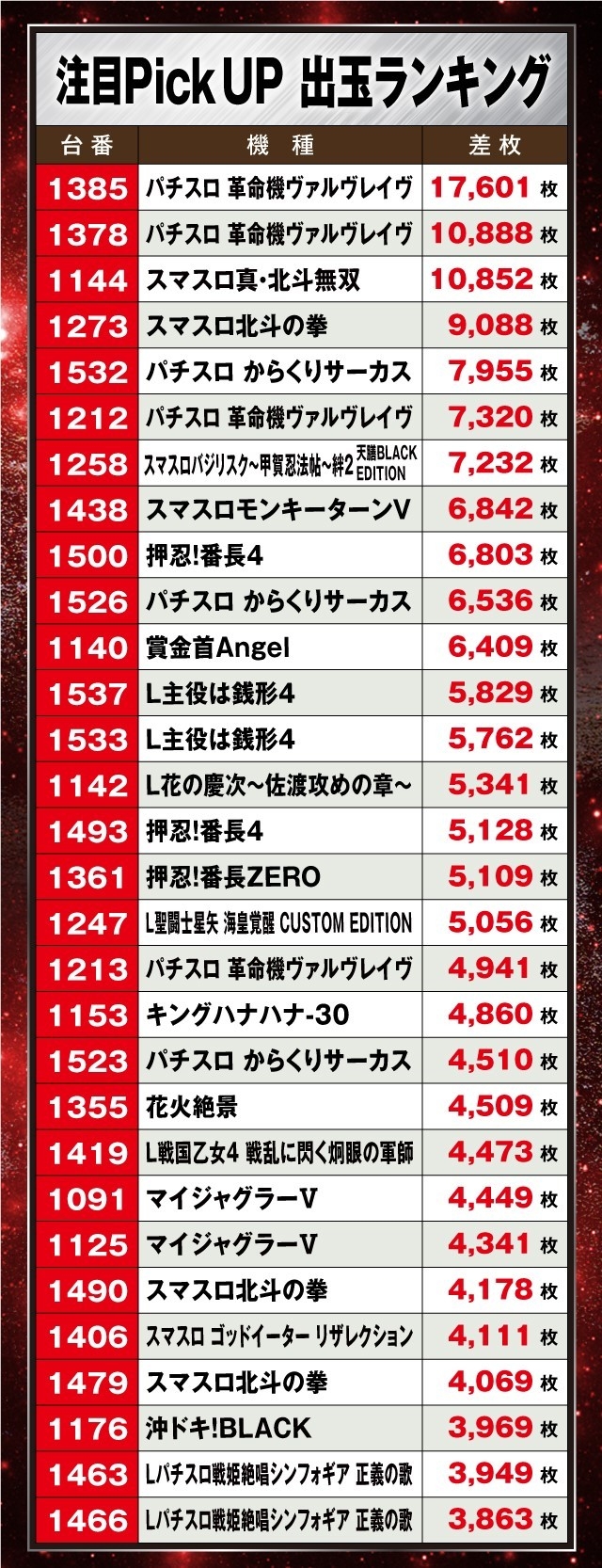 今回は定番機種を中心に好調な台を多数確認、出玉ランキングトップ3は全て万枚を超える圧巻の結果を残している。特に『パチスロ 革命機ヴァルヴレイヴ』は万枚以外にも+7,320枚、+4,941枚を叩き出した台もあり、終日熱気に満ち溢れていた。