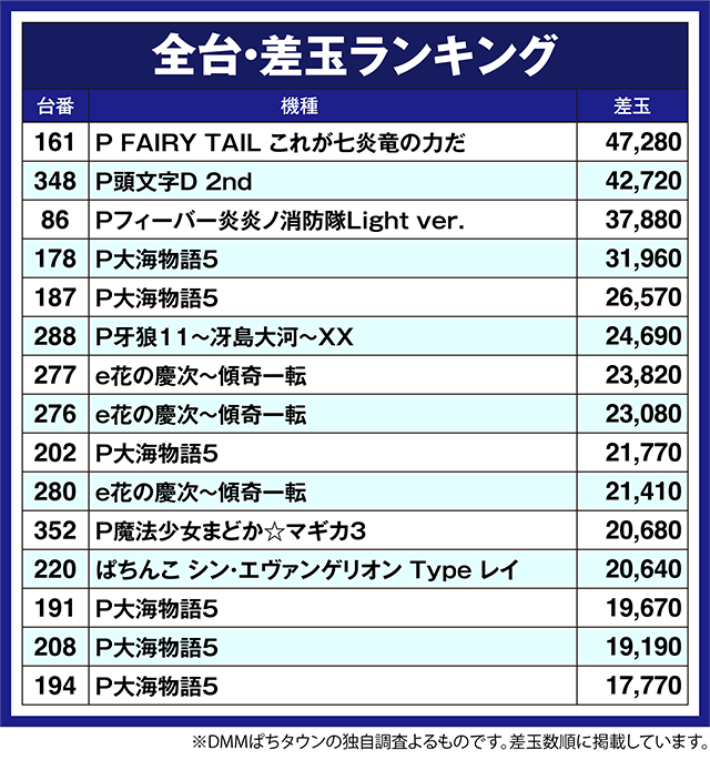 161番台の「P FAIRY TAIL これが七炎竜の力だ」や348番台の「P頭文字D 2nd」が、最終的に+42,000ptオーバー。