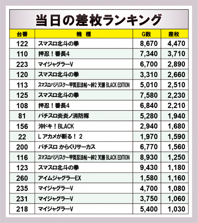 この日のトップ差枚数を叩き出したのは、『スマスロ北斗の拳』で+4,000枚OVERを記録!次いで、『押忍!番長4』で+3,000枚OVERをマークし、人気スマスロ機が好調ぶりをアピールしていた。同時に『ジャグラー』シリーズも名を連ねており、スペック問わずあらゆる機種にチャンスが眠っていた様子が窺える。