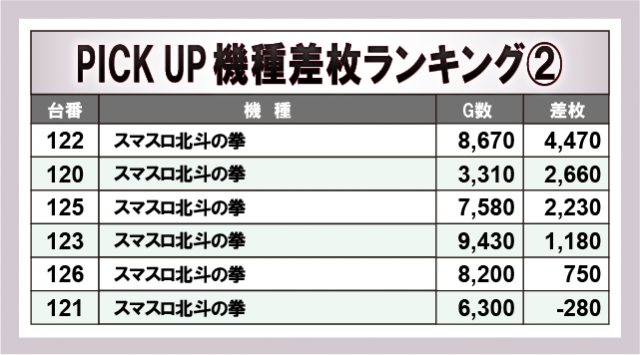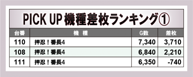 上表を見ての通り、やはり『押忍!番長4』『スマスロ北斗の拳』と人気AT機の活躍が目立っていたのが鮮烈である。終日を通して打ち込まれた台が多くあり、有意義な時間を過ごせる環境にあったと言えるだろう。