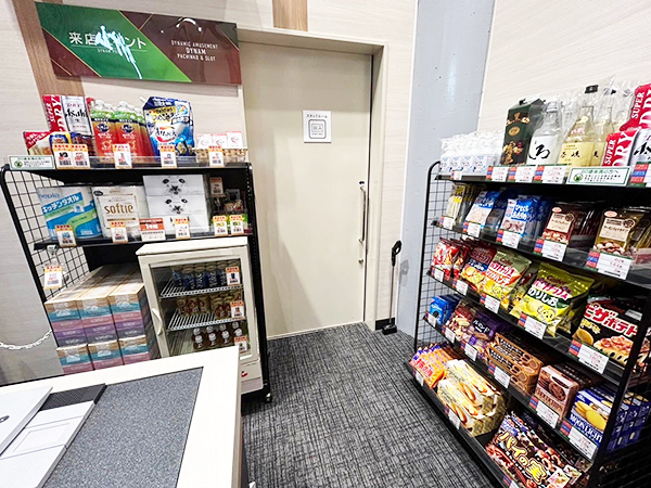 景品コーナーにはお菓子や酒類、来店ポイントで交換できるアイテムなどが並んでおり、プレイヤーたちの興味を引いていた。