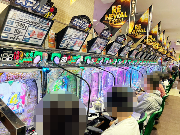 16時ごろの4円パチンコをチェックすると「e Re:ゼロから始める異世界生活 season2」や「e花の慶次〜傾奇一転」、「ぱちんこ シン・エヴァンゲリオン Type レイ」が活況の様子。機種性能を上手く引き出すプレイヤーを複数目撃している。