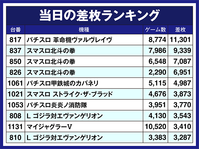 1053番台の「パチスロ炎炎ノ消防隊」と1131番台の「マイジャグラーⅤ」も好結果を残した。