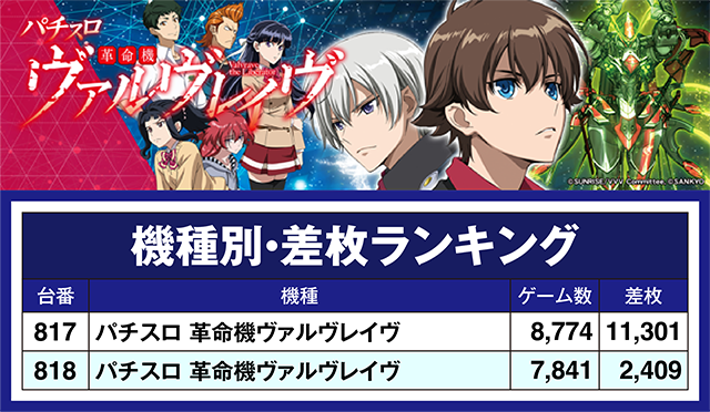 817番台の「パチスロ 革命機ヴァルヴレイヴ」が11,000ptオーバー!