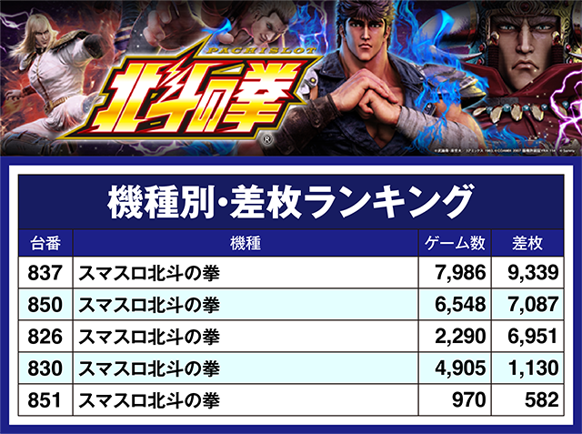 「スマスロ北斗の拳」では、837番台が9,339pt。850番台と826番台も6,900ptを上回った。