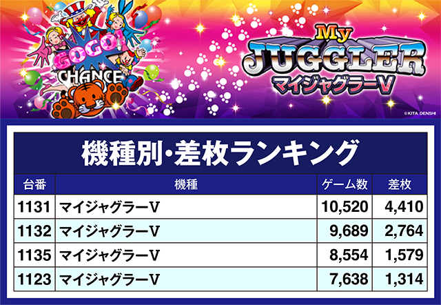「マイジャグラーⅤ」の1131番台が4,400ptオーバー。