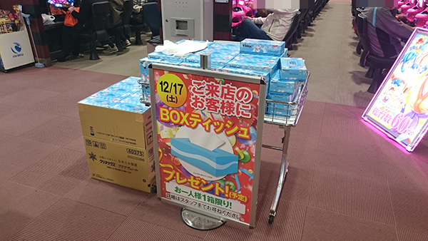 この日のホール内では、来店したプレイヤーにボックスティッシュが配られており、こちらも好評であったようだ。