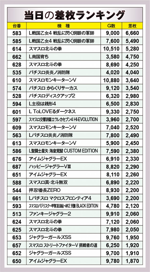 『L戦国乙女4 戦乱に閃く炯眼の軍師』にて5~6,000枚OVERを確認でき、『スマスロ北斗の拳』でも5,000枚OVERが発生した。それ以上に印象的なのが回転数の多さで、2台の万回転OVERが見られるだけでなく、8~9,000回転OVERも多く発生。多くのファンが相当な手応えを感じていた様子で、有意義な時間を過ごしていたのは間違いだろう。