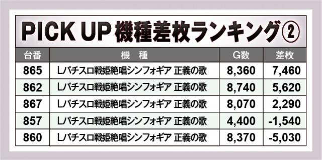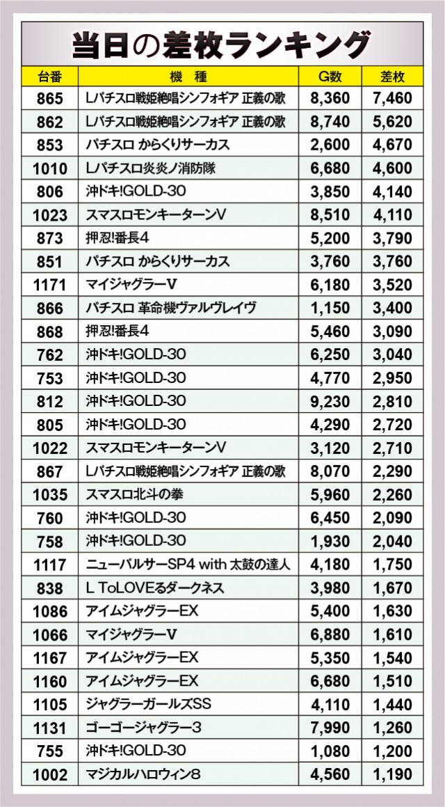『沖ドキ!GOLD-30』は半数以上がプラス差枚を達成しており、それでいてまとまった出玉を確保していたことから、店内随一となる熱量を放っていた機種だ。一方で『Lパチスロ戦姫絶唱シンフォギア 正義の歌』も大きな熱気を放ち、『押忍!番長4』『パチスロ からくりサーカス』も気を吐いていたことから、これらの活躍は目を見張るものがあったと言える。
